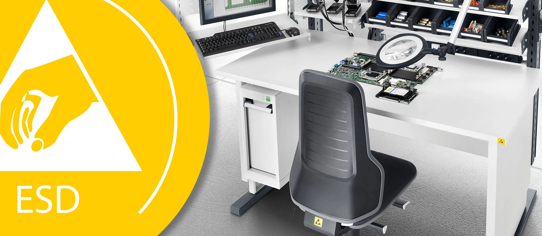 La scelta dei materiali e la tecnica di assemblaggio ottimali fanno sì che le sedie da lavoro a norma ESD di Bimos evitino la carica elettrostatica delle postazioni di lavoro elettroniche. In questo modo i componenti ad alta sensibilità sono costantemente protetti.